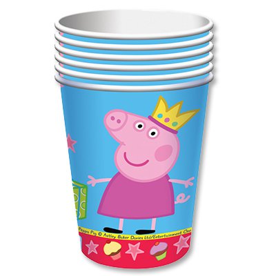 Пеппа нарядилась в костюм принцессы и пригласила друзей на маскарад. Вокруг развешаны шарики, а стол накрыт праздничной посудой. В у паковке 6 бумажных стаканов объемом 210 мл.